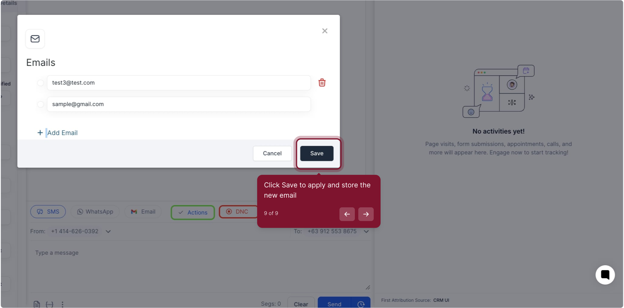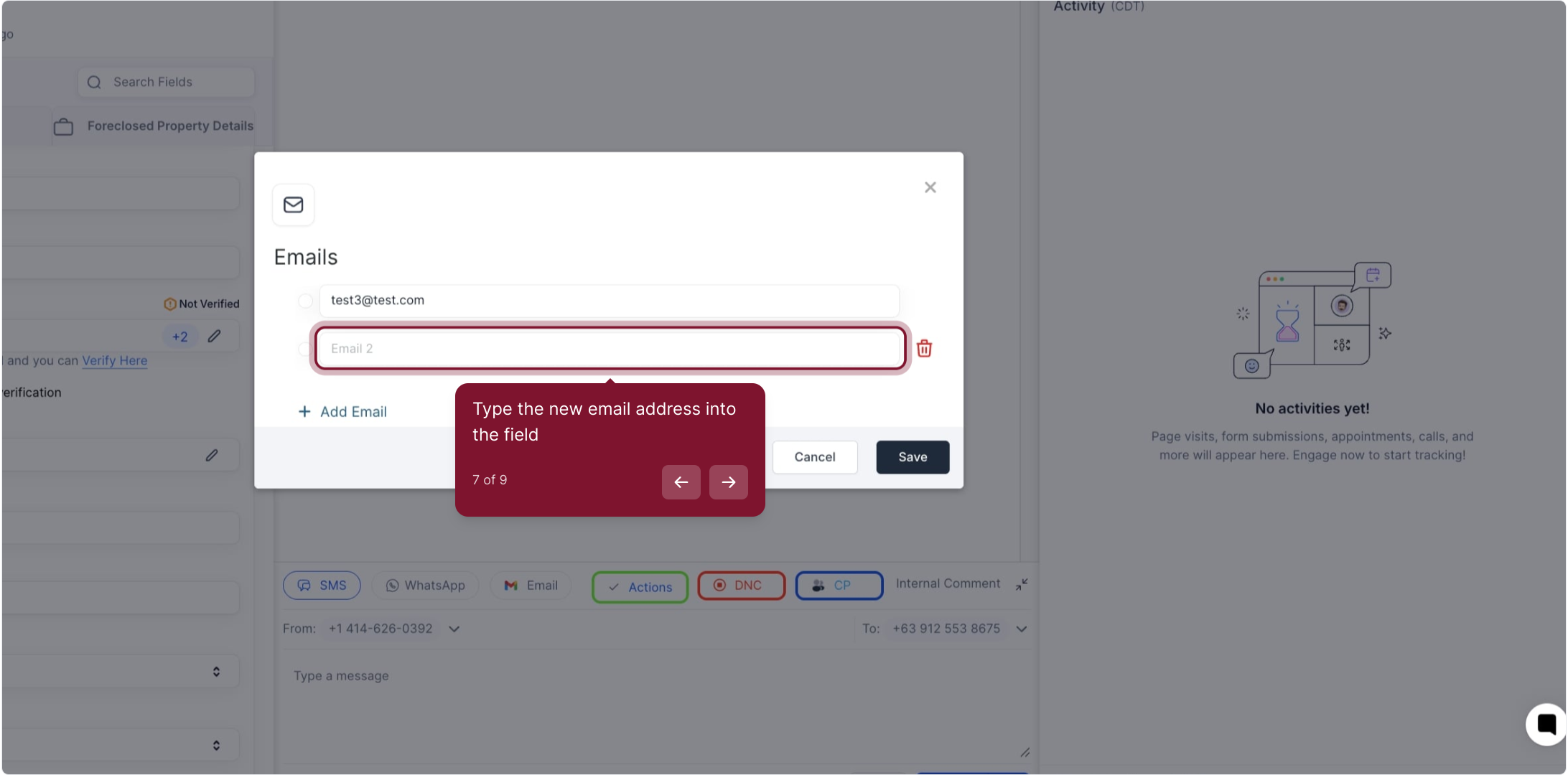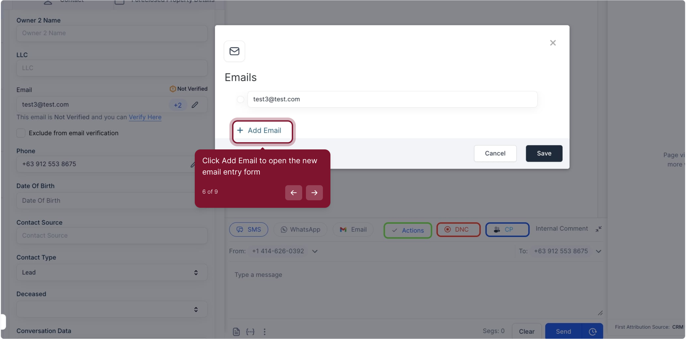 The "Multiple Emails for a Contact" feature allows you to add more than one email address to a contact's details. With this feature, users can easily manage and edit multiple email addresses for a contact, and choose a primary email that will be used for all actions and interactions.