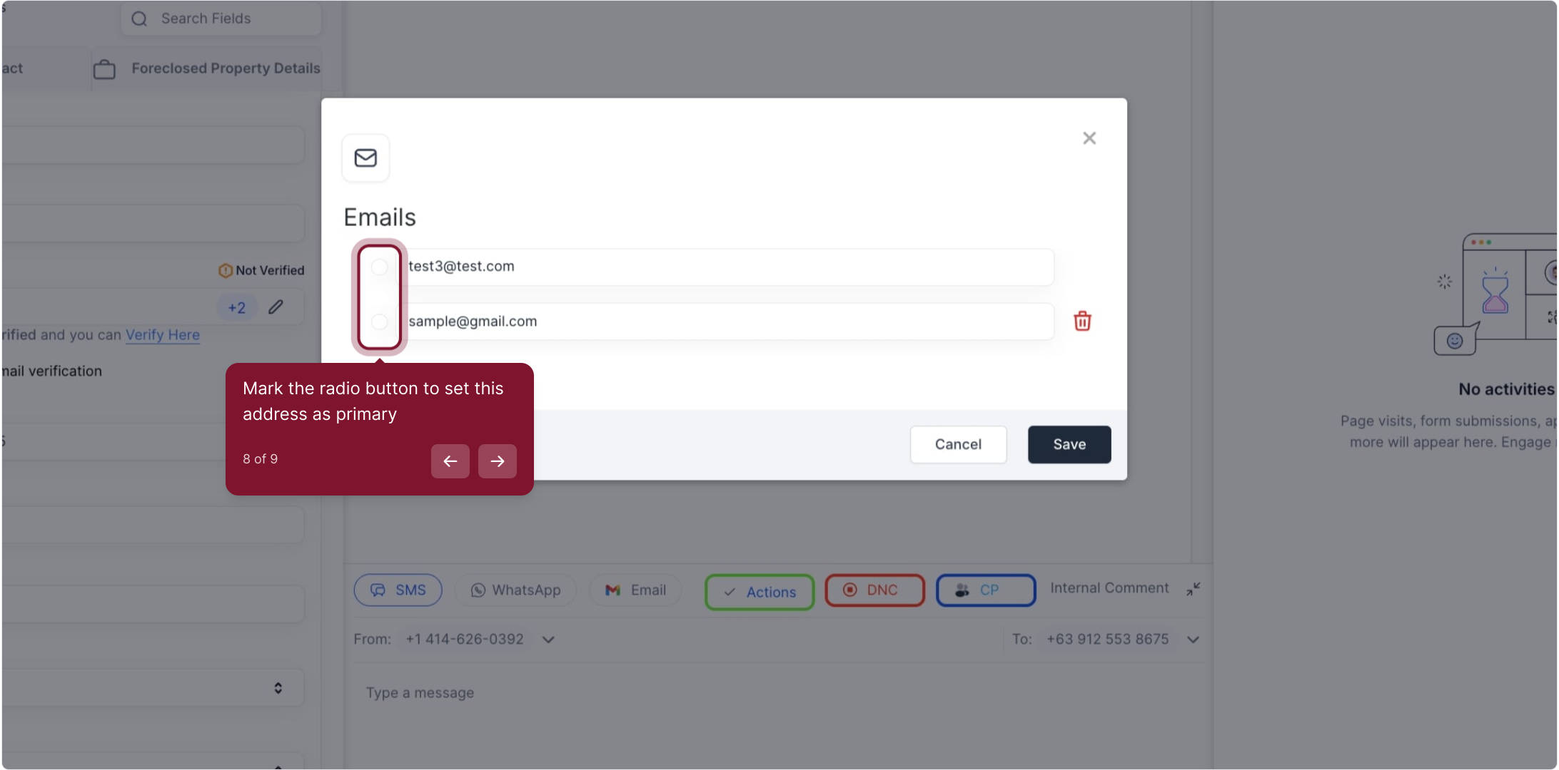 To choose the primary email address, simply click on the circle next to the desired email. This will make the selected email the primary one for all communications and interactions with that contact