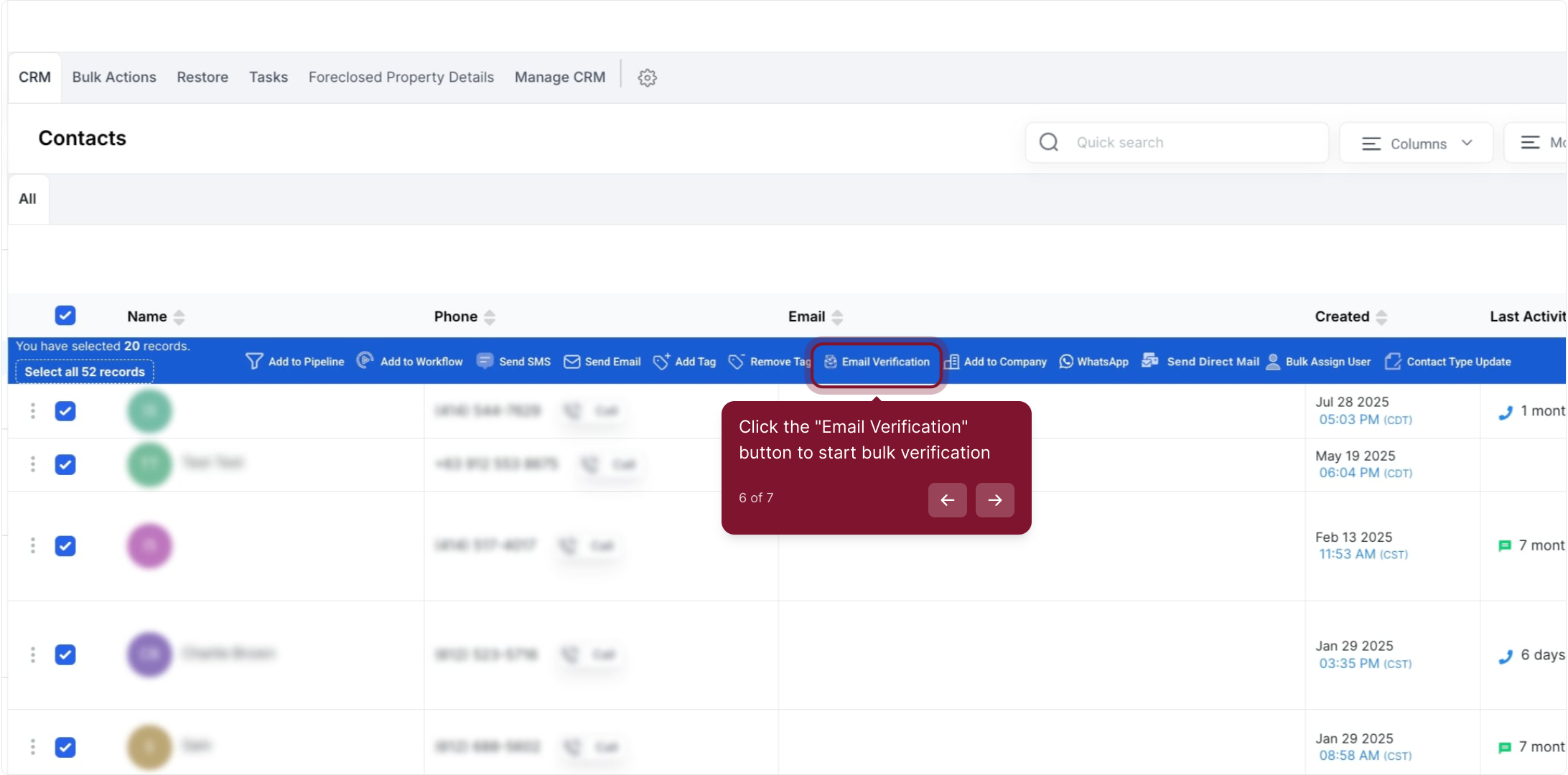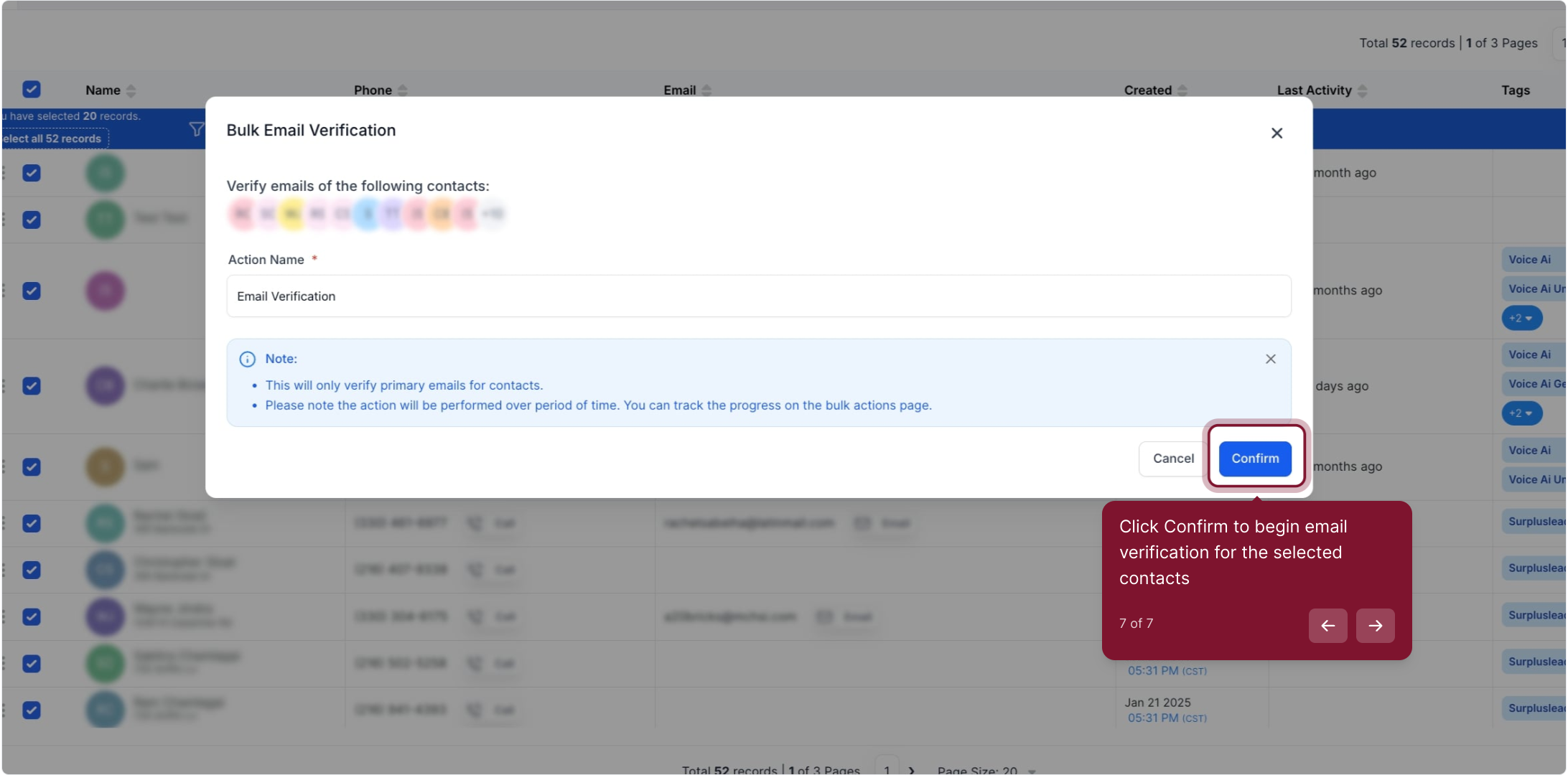 7. Click Confirm to begin email verification for the selected contacts